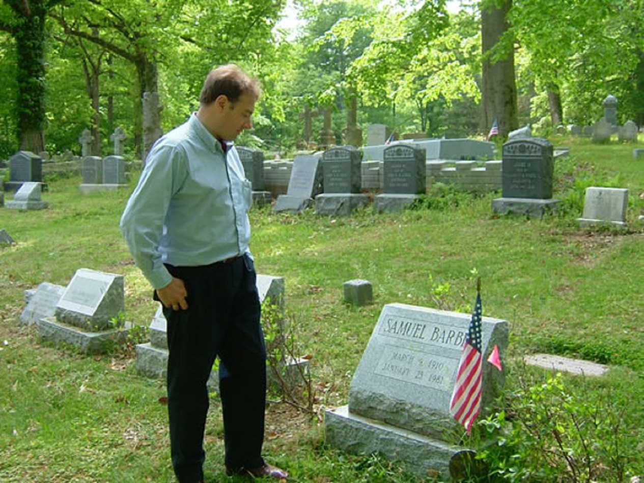 The composer at the grave of Samuel Barber in West Chester in 2005